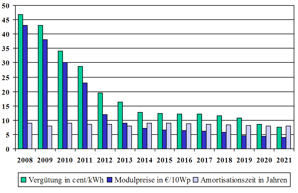 Die Kosten einer PV-Anlage sind in den letzten Jahren insbesondere durch Preissenkungen bei den Modulen drastisch gefallen. Im Vergleich zum Jahr 2008 haben sich die Modulpreise von ca. 4,30 € pro Wp 2024 auf weniger als 0,13 € pro Wp verringert. Die Amortisationszeit einer neuen Anlage hat sich in den vergangenen Jahren ebenfalls verringert. Sie liegt, abhängig von der Anlagengröße und dem Eigenverbrauchsanteil, in der Regel zwischen 5,5 bei größeren Anlagen und 8 Jahre bei kleinen Anlagen.